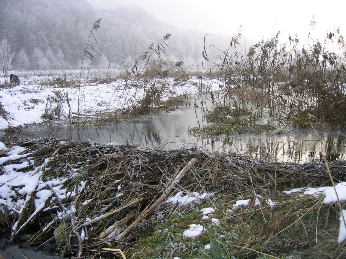 Im Jahre 2001 konnten zum ersten Mal umfangreiche Fraßspuren gefunden werden (hier am Inn bei Ebing). Inwischen kann man gefällte Bäume, Biberrutschen und Nagespuren am Inn überall entdecken. Der unten gezeigte Damm wurde vom Biber auf der BN-Fläche in Jettenbach angelegt. Biberteiche sich wichtige Lebensräume für viele Amphibien.