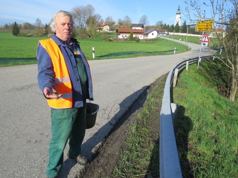 Der Mensch hat meist durch Straßen ihre Wanderwege durchschnitten und viele würden ohne Hilfe überfahren werden. Durch den Ausbau dieser Straße vor zwei Jahren wurden hohe Bordsteine verbaut. Diese stellen ein Problem bei der Rückwanderung der jungen Kröten und Frösche dar. Das Landratsamt Mühldorf kümmert sich in Zusammenarbeit mit dem Straßenbauamt um eine Lösung, damit die Amphibienbabies ab Mai wieder zurück in ihr Habitat wandern können und nicht in Gullys verenden müssen.