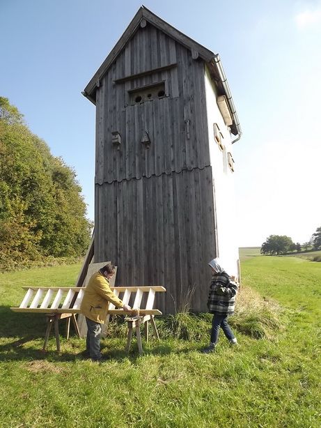 Einen Samstag lang werkelten 6 Mitglieder der Neumarkter Ortsgruppe am ehemaligen Trafohäuschen am Ende des Brunnenweges, das sie seit Jahren Stück für Stück als „Tierhotel“ und Beobachtungsstation einrichten für das Schilfgebiet am Wasserrückhalte-becken. An den stellenweise mit Holz verkleideten Außenwänden hängen Nistkästen und befinden sich Schlupflöcher für Insekten. Alle Kästen wurden gereinigt. Unter der Dachrinne ist der Kasten für Mauersegler und im Dachgeschoß der Brutkasten für eine Schleiereule. Im doppelten Boden des Erdgeschosses haben Igel ihre Winterquartiere.
