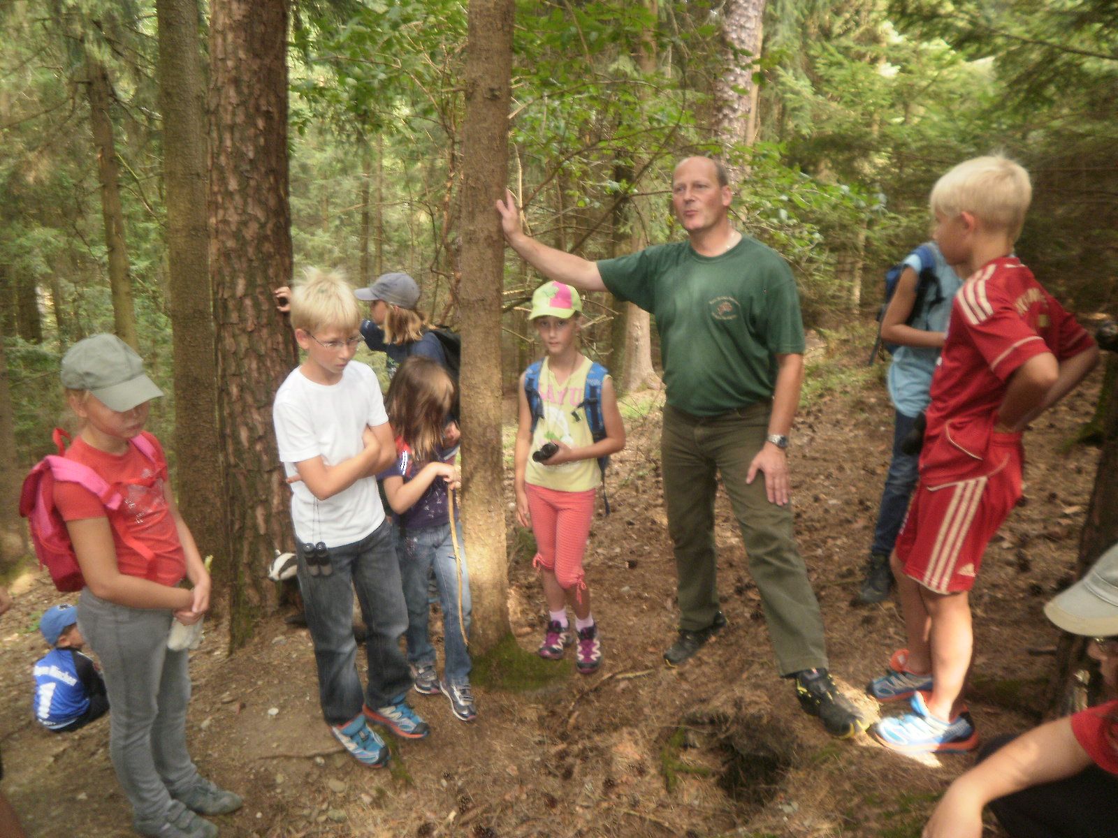 Man untersuchte Fichtenzapfen, die von Eichhörnchen abgenagt wurden und fand einen Dachsbau, der mittlerweile von einem Fuchs bewohnt wird. Sebastian Linner hatte für Abwechslung gesorgt: Er hat an vielen Stellen präparierte Tiere in der richtigen Umgebung versteckt. So konnten die Kinder Tiere entdecken, die sie normalerweise nicht am helllichten Tag im Wald antreffen würden. Ob sich die Begeisterung Linners für den Verzehr von kleinen Würmern, die in alten Fichtenzapfen zu finden sind und die im Darm ein Antibiotikum produzieren, auf die Kinder übertragen hat, bleibt allerdings zweifelhaft. Immerhin haben sie interessiert zugehört und wollten die winzigen Würmer genau anschauen.