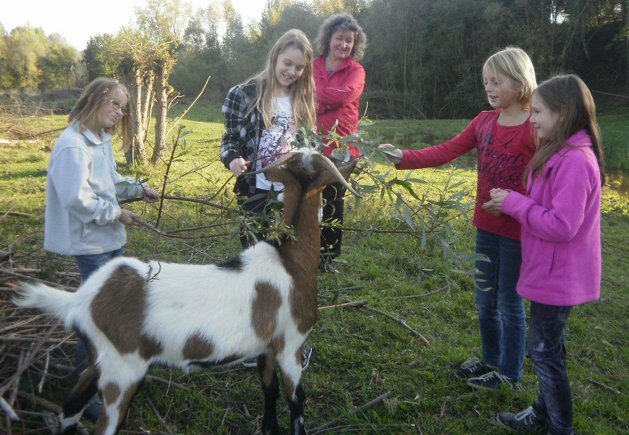 Jetzt wollte man endlich sehen, was aus der Kiesgrube geworden ist und wie sich die Arbeit ausgewirkt hat. Zwischenzeitlich war oberhalb der Grube ein Aussichtsstand gebaut worden, von dem aus die Kinder einen ersten Überblick erhielten. Aber natürlich konnten sie auch hinein gehen und die Tiere von Nahem betrachten. Die Rinder, u.a. Galloways, hielten respektvollen Abstand und nach einer Weile der Gewöhnung grasten sie friedlich weiter. Ganz anders waren die Ziegen. Eine ganze Herde dieser neugierigen Tiere kam angehoppelt und beknabberten Anoraks und Pullover der Kinder, ließen sich aber auch gerne von ihnen füttern und streicheln. Es handelte sich dabei um Tauernschecken, eine alte, vom Aussterben bedrohte Rasse. Die Tiere sind äußerst wendig und klettern auch gerne, weshalb ein Spezialzaun um das etwa 10 ha große Gelände herum führt.