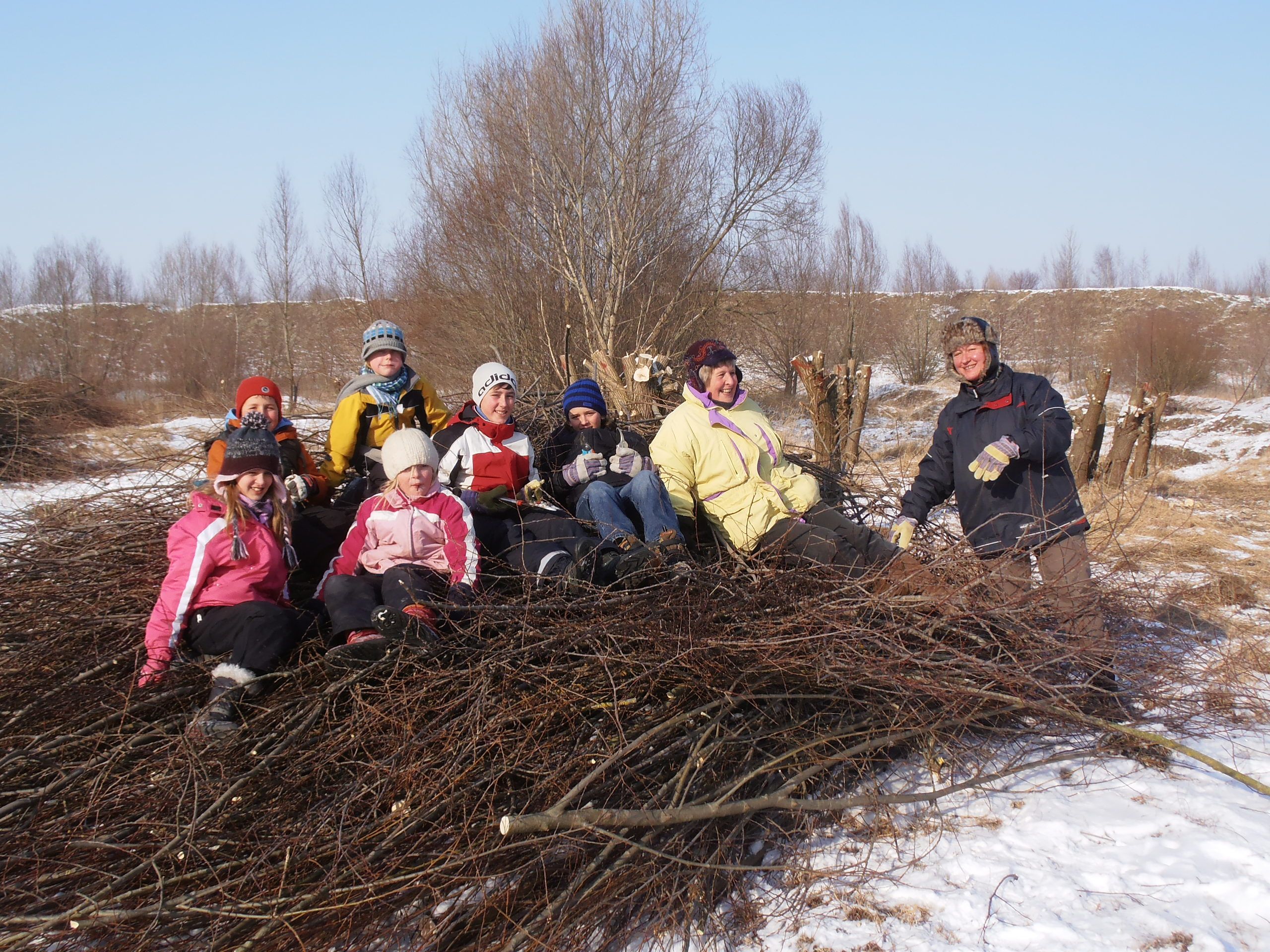 Bei strahlendem Sonnenschein und eisiger Kälte haben die Haager Kinder bei einer Großaktion in der Kiesgrube des Bund Naturschutz geholfen, Weiden auf Stock zu setzen und die abgeschnitten Zweige und Äste auf große Holzhaufen aufzutürmen.