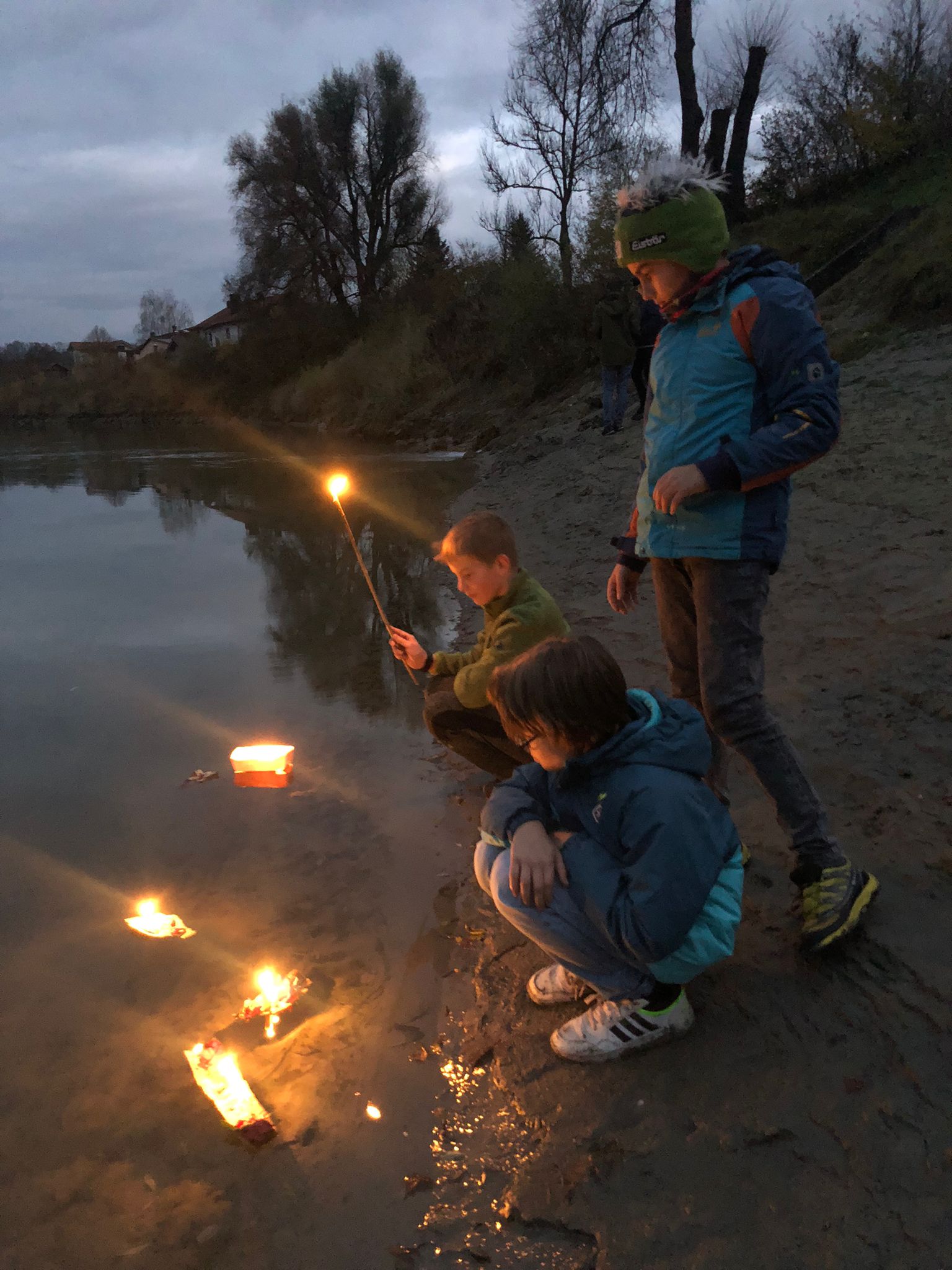 Im Herbst haben wir diese dann endlich auch mal fahren lassen können. Sie sahen sehr schön aus, die leuchtenden Schiffe auf dem Inn, die nur aus Naturmaterialien und Kerzen bestanden. Außerdem haben wir versucht mit Erde zu malen und das Wasserfiltersystem des Waldes erforscht. Beim Rama Dama in Kraiburg waren wir natürlich auch mit dabei. Insgesamt also ein sehr gelungenes Kindergruppen-Jahr!