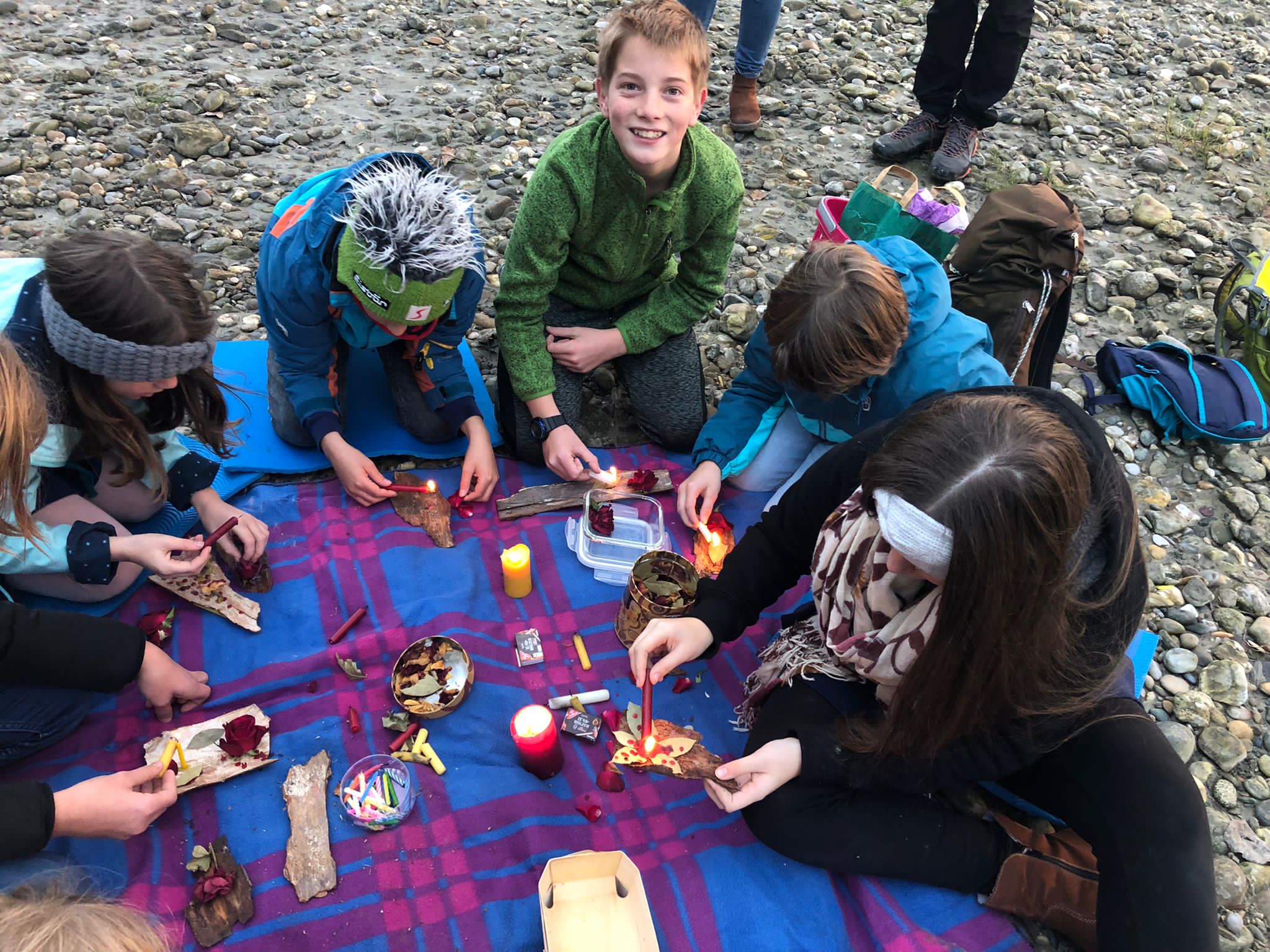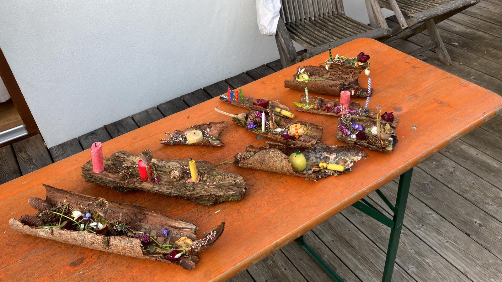 Ansonsten haben wir schöne Plätze in der Natur um Kraiburg herum gefunden. Im Frühling haben wir uns die Frühlingsblüher angeschaut und einige für ein Herbarium gepresst. Wir haben wieder Vogelfutter hergestellt und im Wald aufgehängt und auch zwei mal Rindenschiffe gebaut.
