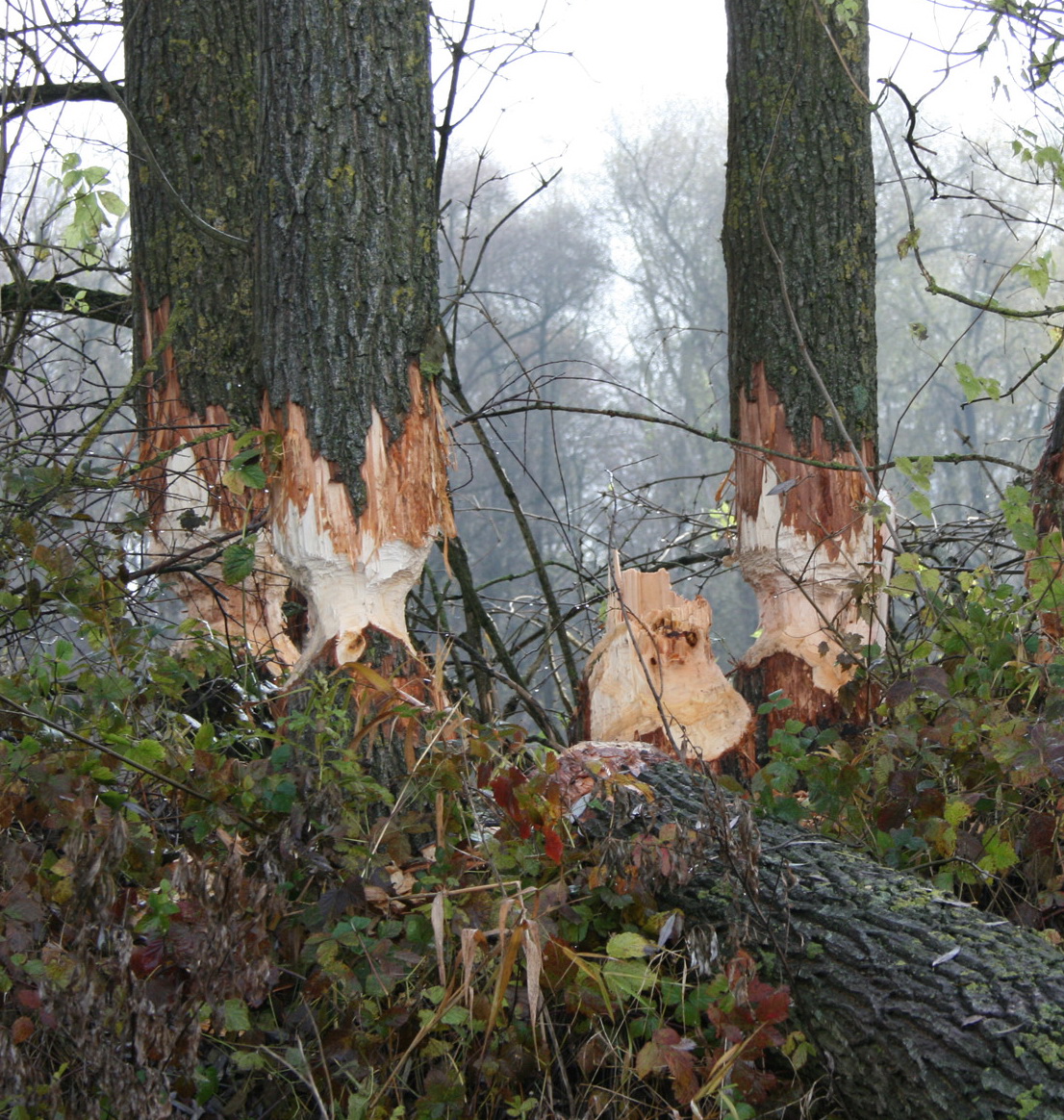 Im Jahre 2001 konnten zum ersten Mal umfangreiche Fraßspuren gefunden werden (hier am Inn bei Ebing). Inwischen kann man gefällte Bäume, Biberrutschen und Nagespuren am Inn überall entdecken. Der unten gezeigte Damm wurde vom Biber auf der BN-Fläche in Jettenbach angelegt. Biberteiche sich wichtige Lebensräume für viele Amphibien.