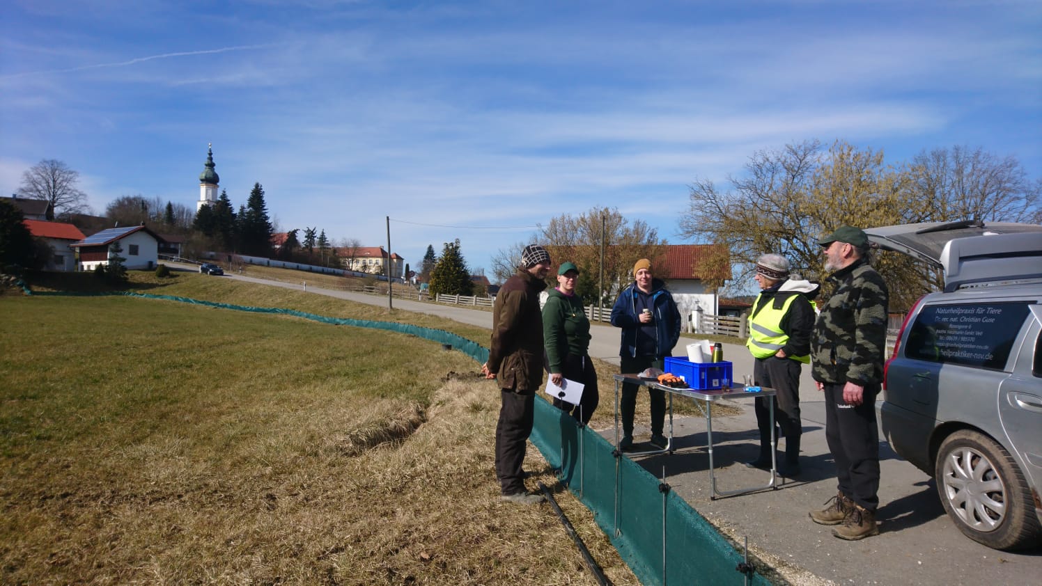 Unter der Anleitung von Eva und Christian Guse fanden sich heute insgesamt zehn BN-Mitglieder, die den Krötenzaun aufbauten. Die Strecke an den Weihern entlang bis zum Ortseingangsschild und dazu noch ein Stück der Sankt Veiter Straße schien endlos zu sein. Mit Warnwesten, Spaten und guter Lane ausgestattet, ging es los. Nach dem Prinzip ‘Viele Hände, schnelles Ende’ waren die Arbeiten nach etwa vier Stunden erledigt. Der Einsatzplan für das Sammeln unserer kleinen Freunde steht selbstverständlich. Eva und Christian Guse haben das Wetter analysiert und den Startzeitpunkt für das Sammeln auf Montag, den 10.03. festgesetzt.