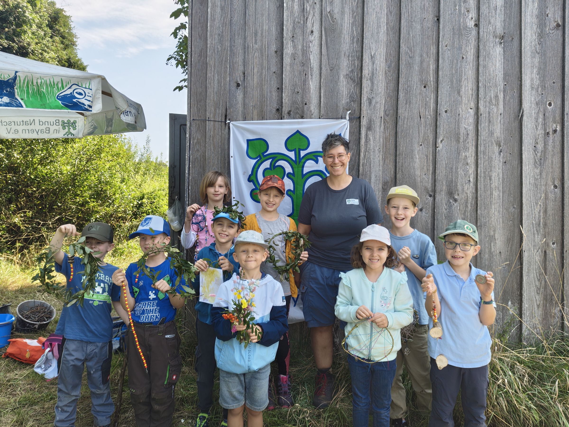 Bei strahlendem Sonnenschein kamen neun Kinder im Alter von 8 bis 12 Jahren zum Ferienprogramm der Ortsgruppe Nördlicher Landkreis Mühldorf zusammen, um einen tollen Nachmittag vor dem Trafohäuschen zu verleben. Unter Anleitung der Ortsgruppenvorsitzenden Tina Winterer und ihrer Stellvertreterin Eva Guse wurde mit Naturmaterialien gebastelt was das Zeug hielt. Dafür wurden im nahe gelegenen Wäldchen Äste, Zapfen, Moose, Blätter und andere Schätze gesammelt. Am Trafohaus zurück machten sich die Kinder ans Werk und bastelten Traumfänger aus Weidenruten, Schlüsselanhänger aus Astscheiben und Perlen, sowie Gemälde, die mit Pflanzenfarbe verziert worden. Die Kinder waren so vertieft, dass sie gar keine Zeit für eine Brotzeit oder Pause hatten. Zum Schluss wurde noch ein Foto mit den Kunstwerken gemacht. Mit leuchtenden Augen nahmen die Kinder ihre Schätze und ein Sträußchen für die Mama mit nach Hause.