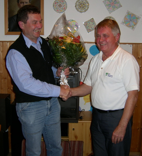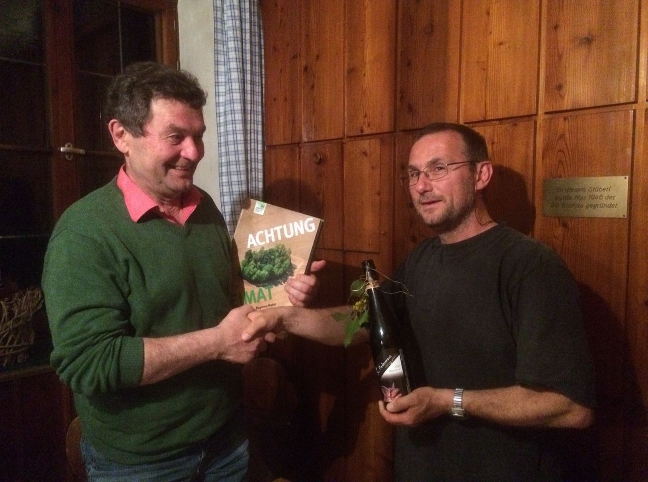 Seit 1979 ist Günther Manz Mitglied beim BUND und seit der Gründung der Ortsgruppe 1984 deren 1. Vorsitzender. "Das ist jetzt genug" meinte Günther Manz. Beim Abschied hob Dr. Andreas Zahn, 2. Kreisvorsitzender hervor, dass Günther Manz viel für den Erhalt der Natur und ihrer Lebewesen gemacht hat. So kümmerte sich der gelernte Imker um den Erhalt von Hornissen und seltenen Wespenarten. Doch auch die Betreuung des Biotops in der Langrieger Kiesgrube, die Organisation von Veranstaltungen und die regelmäßigen Treffen der Ortsgruppenmitglieder lagen ihm am Herzen. Mit dem interessanten Buch des BN - "Achtung Heimat" und einer Flasche "Fledermauswein" bedankte sich Andreas Zahn im Namen der Kreisgruppe für die vielen Stunden Naturschutzarbeit, die in 30 Jahren so zusammen kommen.