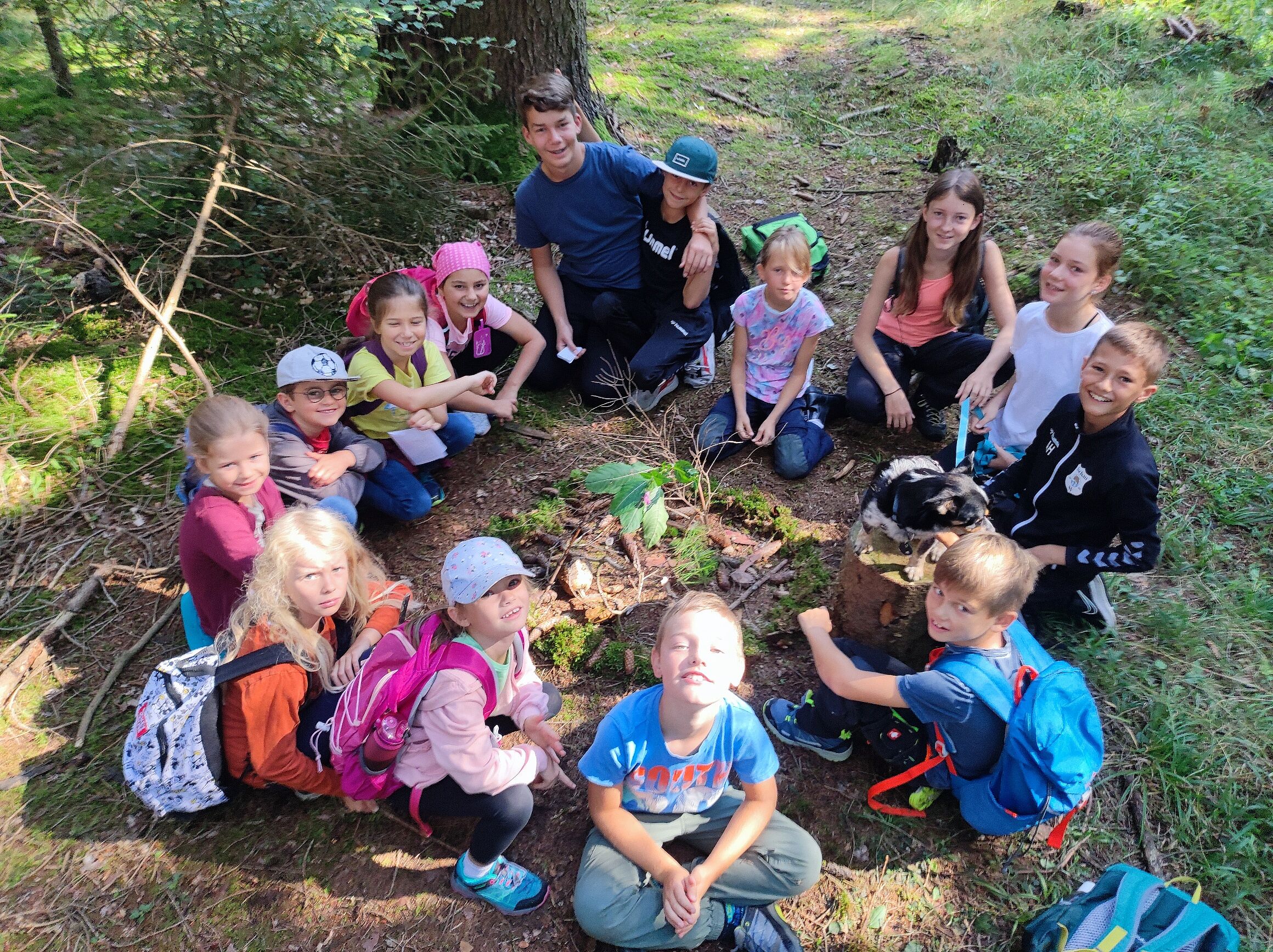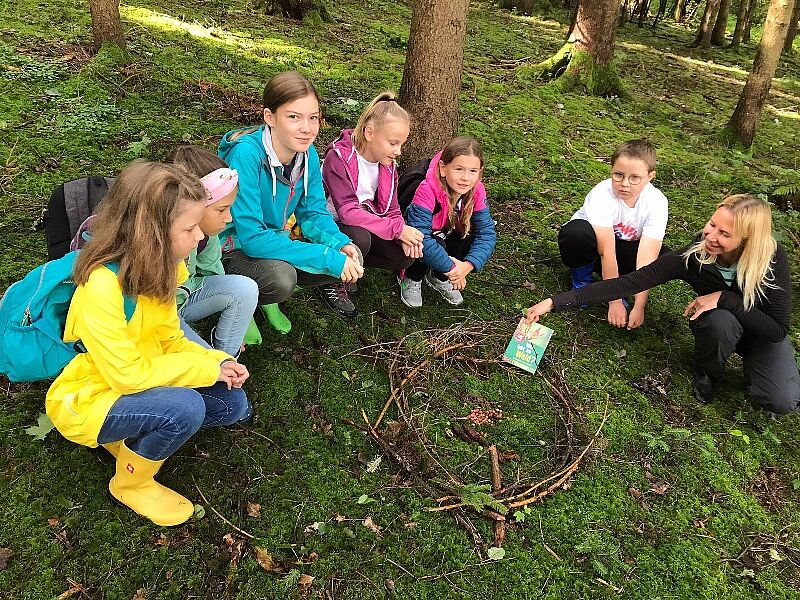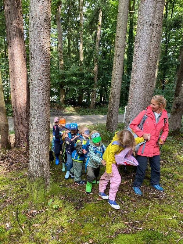 Beim Wahrnehmungsspiel "Als Raupe durch den Wald" erlebten die Kinder mit geschlossenen, offenen oder verbundenen Augen die Vielfalt im Wald mit allen Sinnen, um anschließend ihre vielen Erlebnisse und Entdeckungen beim Wandern zum Abholplatz miteinander auszutauschen.