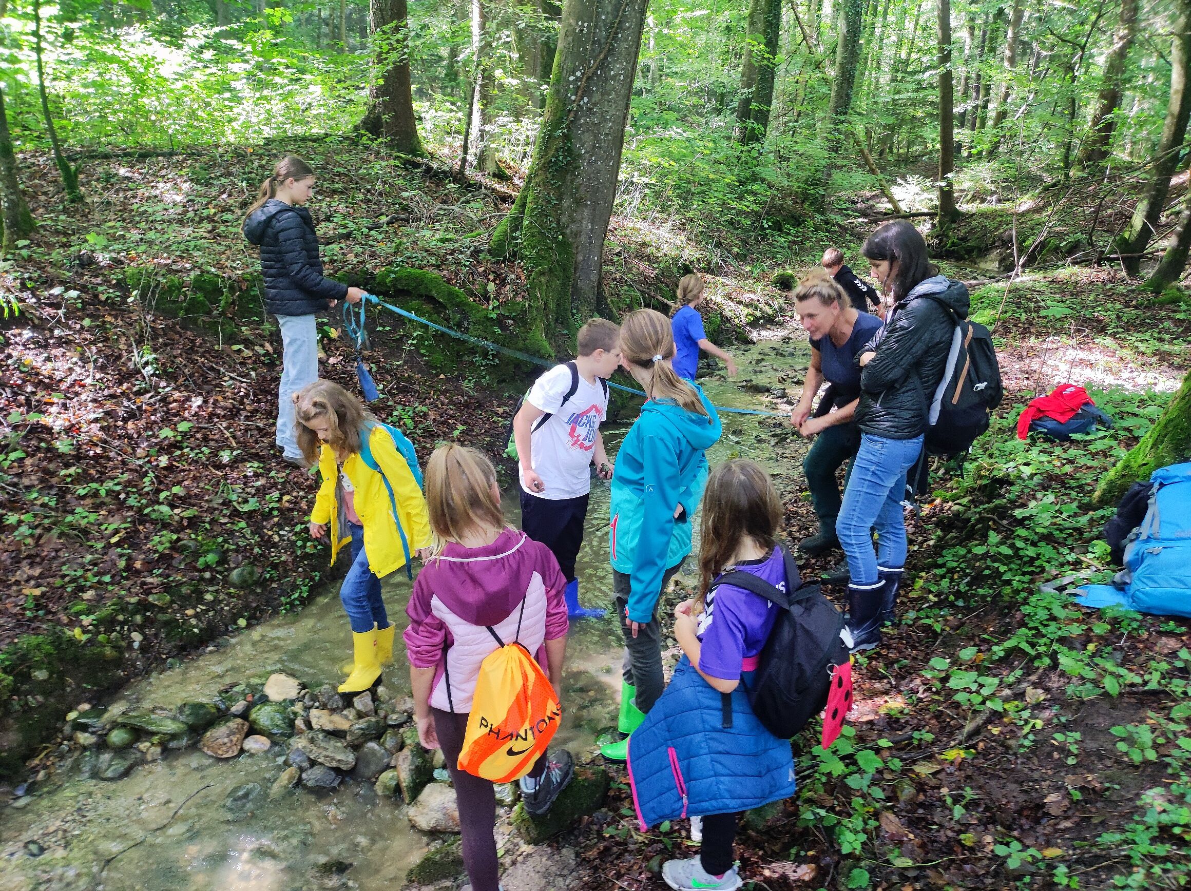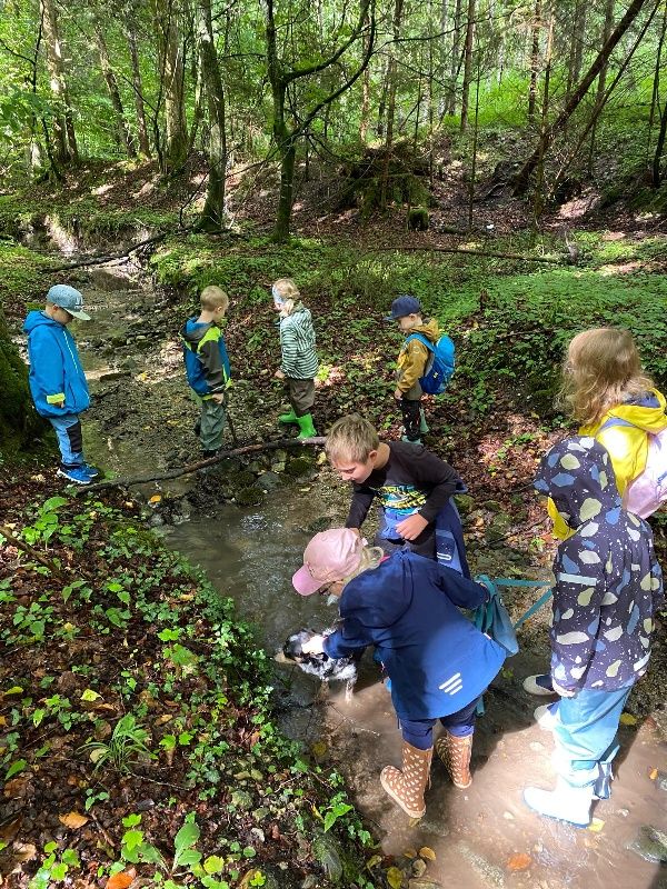 Die Kinder waren unterwegs sehr aufmerksam und teilten ihre Entdeckungen, Fragen und ihr Wissen miteinander. Am kühlen Bach klang der schöne Vormittag mit einem Picknick, Forschen, Entdecken, Schnitzen und Wasserspielen aus.