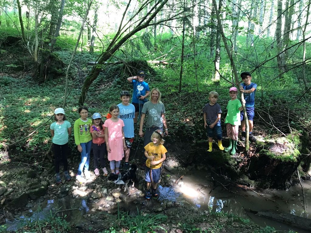 ... so lautete das Motto für die neun Kinder, die 2023 mit der Ortsgruppe Aschau am Inn des Bund Naturschutzes auf Abenteuersuche in den Wald starteten. Nach spannenden Infos über das Eichhörnchen versuchten die Kinder sogleich selbst, wie dieser geschickte Kletterer seine Wintervorräte versteckt und warum er "Gärtner des Waldes" genannt wird. Es ist gar nicht so einfach, alle Nüsse wiederzufinden! Bei der Suche wurden dann tatsächlich echte Eichhörnchen- Spuren gefunden und kurz darauf kletterten und sprangen zwei Eichhörnchen in nächster Nähe durch den Wald! Auf der Blumenwiese hörten die Kinder eine Geschichte zum Thema, wie die Welt wohl aussähe, ohne Bienen, Hummeln und Insekten. Es entbrannte ein lebhafter Austausch über Nutzen und Hilfsmöglichkeiten für diese wichtigen Tiere. Mit Becherlupen wurden daraufhin Grashüpfer, Falter, Spinnen und Bienen beobachtet und bestimmt. Zuletzt ging es weiter zum Bach im Wald. In mit Wasser gefüllten Reifenspuren beobachteten die jungen Waldforscher verschiedene Kröten - und Froscharten, die dort aufgewachsen waren. Am Bach klang der Vormittag mit Staudamm bauen und anderen Spielen mit viel Spaß am kühlen Nass aus.